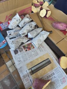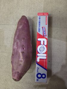 カットしたさつまいもを新聞紙で包んでさらにアルミホイルにも包んでいきます。