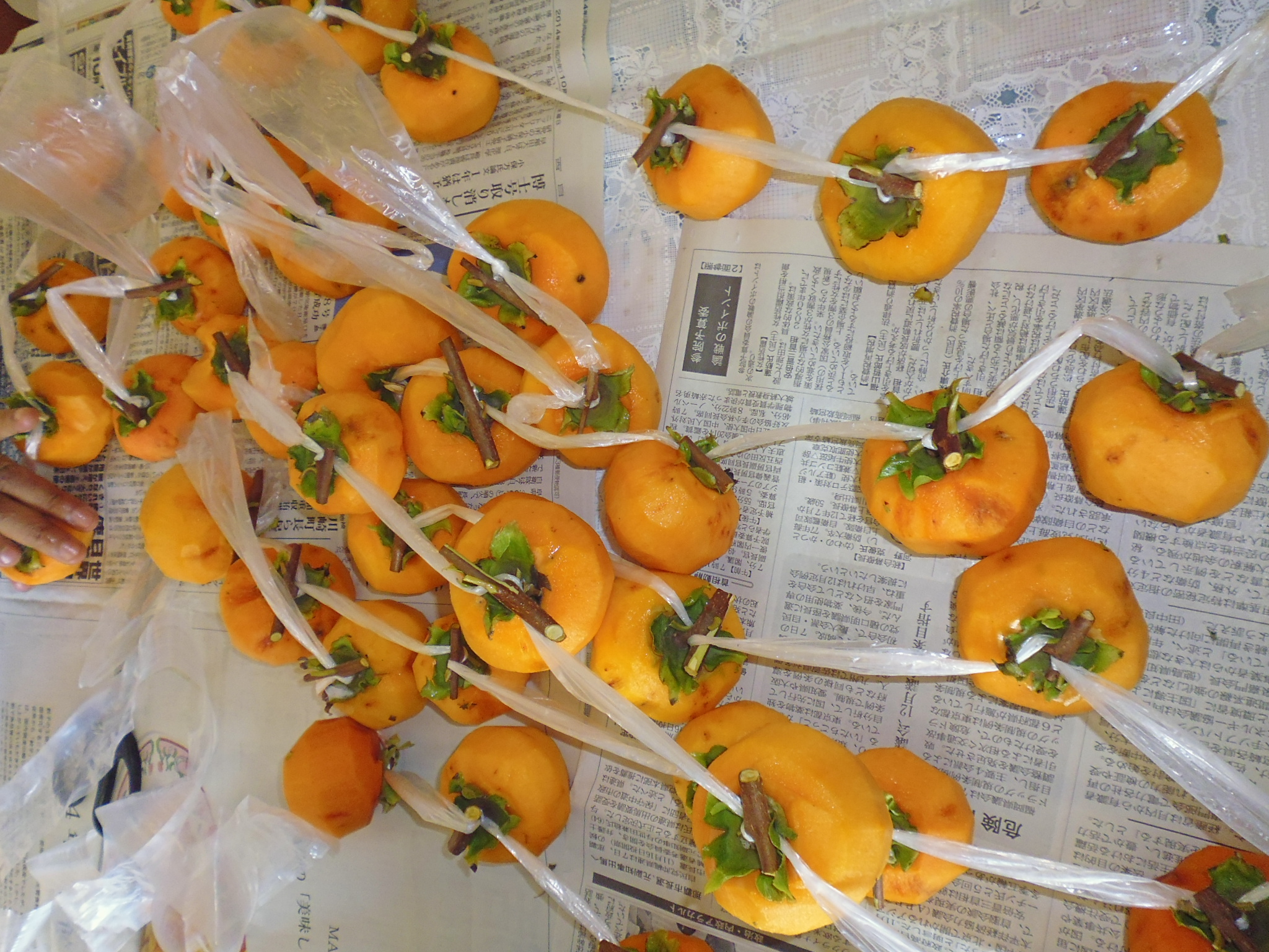 柿の皮をむいて紐に結ぶ作業です。