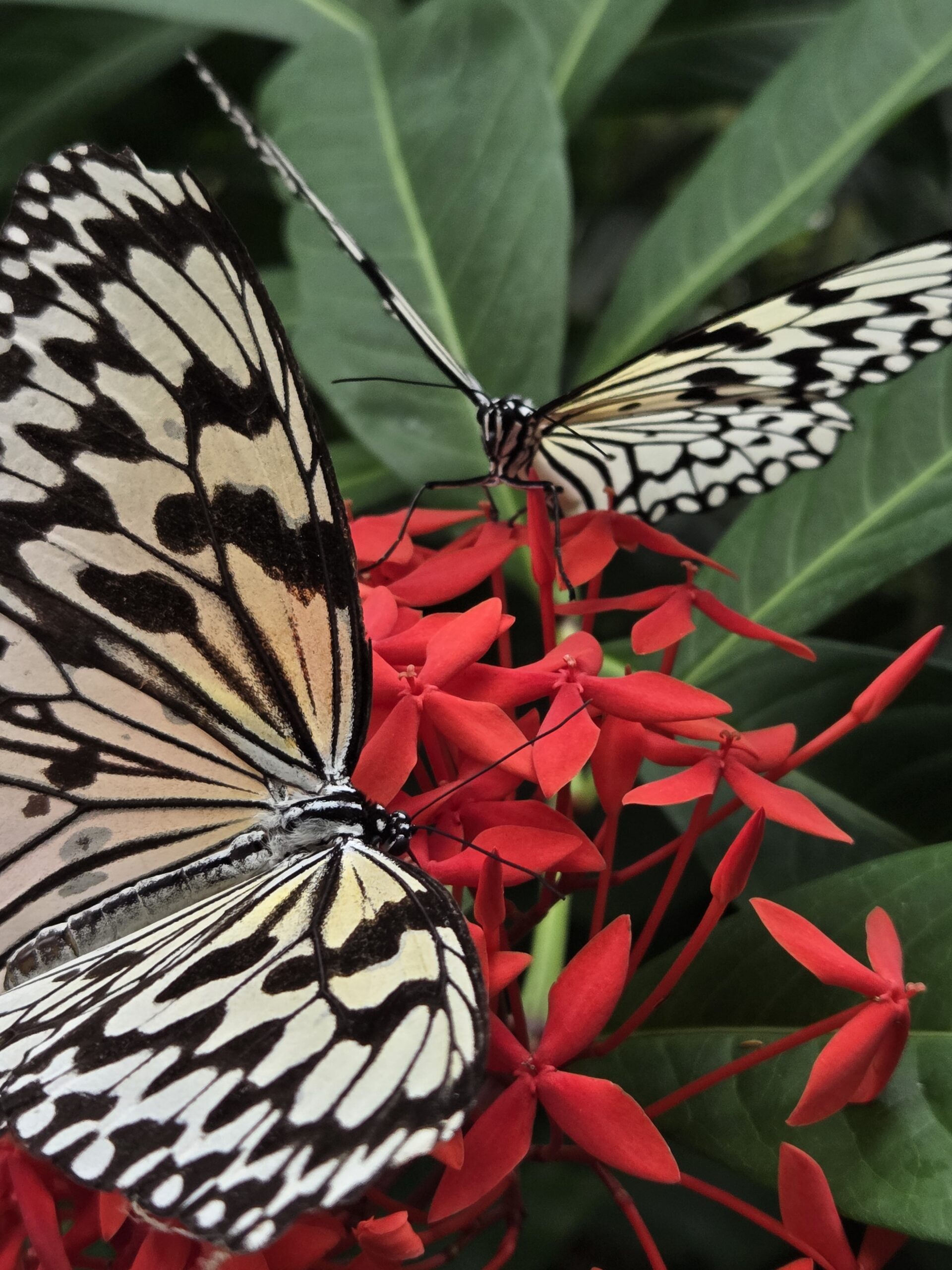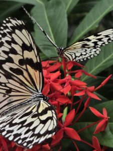 このオオゴマダラは熱帯生態園をたくさん飛び回っており、入園者の頭や顔、肩や手に止まって休憩してくれてました。
